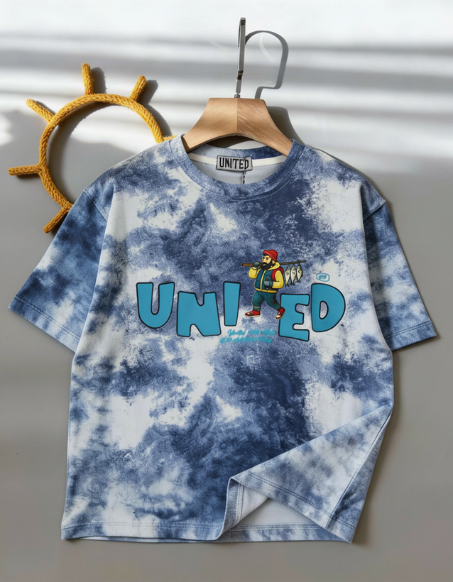 طراحی تایدای آبی-سفید در کنار چاپ کارتونی پسر ماهیگیر روی سینه، حس ماجراجویی و استایل اسپرت جذابی ایجاد کرده که کاملاً مناسب استایل تابستانی و روزمره است.
